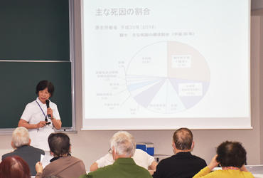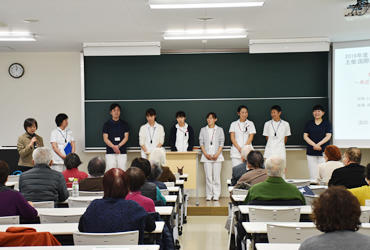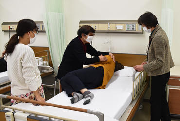 2月5日、看護学部による公開講座を実施しました。今回のテーマは『看護の技をご一緒に ~身近な人を寝たきりにしない技』。まず、野村明美教授が、寝たきりになる原因、平均寿命と健康寿命の差、寝たきりに「しない」「ならない」ことが重要な理由などを紹介し、「寝たきりから脱出する方法は、子どもの発達動作から学ぶこと」との説明がありました。その後、3人一組のグループに分かれて、ベッドで体の位置や向きを変える支援の方法などの演習を行いました。それぞれ活発に意見交換しながら取り組んでいて、どの家庭でも「寝たきり予防」が大きな関心事になっていることを伺うことができました。