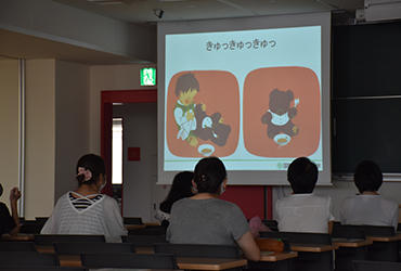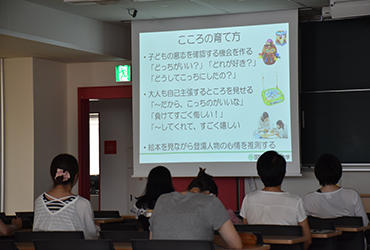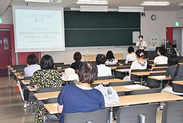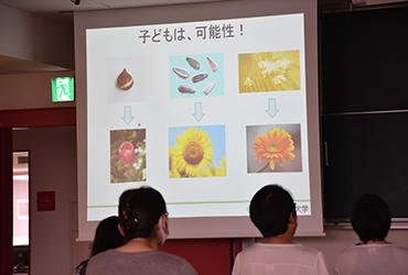8月26日、今年度最初の公開講座を実施しました。言語発達障害が専門の岩﨑淳也講師が『こころとことばの育て方』をテーマに、ことばとこころの健やかな育ちを助ける大人の関わり方についてお話ししました。ことばの習得のベースにあるものは、コミュニケーションへの意欲や能力であり、これを促すためには、大人が目を合わせて反応を示す、同じものに注意を向けるなど、一見ことばの獲得とは無関係に見えることが重要であることを紹介。また、ことばの上達を促す方法としてインリアルアプローチが紹介され、具体的な方法として、子どもの発したことばに1語足して返す方法について話がありました。