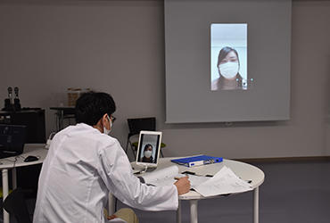前回の読み合わせによって問題点や不明点が洗い出された結果、今回からほぼ完成したシナリオを使っての演習が始まりました。4つのグループに分かれ、医師役と患者役になって、リモートによる医療面接を行いました。多くの模擬患者さんがすでに4年目に入っており、シナリオのチェックから演習への流れは極めてスムーズに進行しています。そして、今年はリモートという新しい形への対応が求められています。