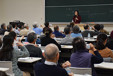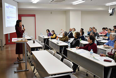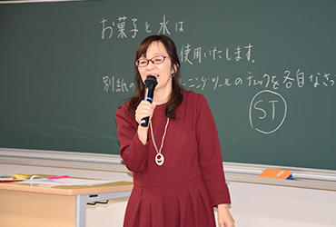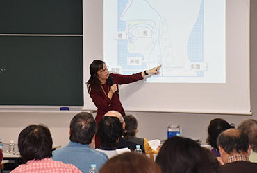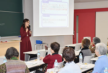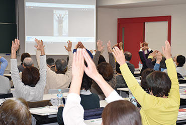 12月13日、言語聴覚学科による公開講座を実施しました。テーマは「誤嚥を防いで元気に長生き -その2」。前回に続き、石山寿子准教授が嚥下(飲み込み)のメカニズムを解説し、加齢によって嚥下機能が低下すると、健康へのリスクが高まるとともに、自分らしい生活に支障をきたすことを実例を交えて伝えました。30秒間に何回ごっくんできるかに挑戦する「反復唾液嚥下テスト」、口の中にオブラートを貼ってパイを食べる「高齢者の口腔内体験」、少量の水を飲むときの様子を観察する「水飲み体験」もあり、最後に、石山准教授が作成した「嚥下体操ビデオ」を見ながら全員で体操を体験しました。