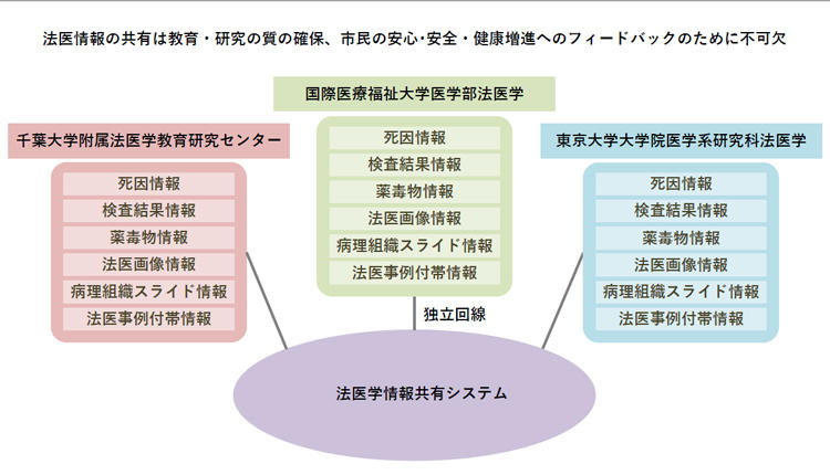 これまで法医学領域において、大学間で総合的な情報共有を行ってきた例はありません。千葉大と国福大は千葉県内の法医学情報の分散を防ぐために、情報共有システムの構築を試みました。その結果、独自の回線により、事例の付帯情報、解剖情報、検査結果などを共有することが可能になり、千葉県内の法医学情報の統計学的調査研究や教育の質の維持が期待できます。また、このシステムを用いて、これまで各大学内のみで行われていた執刀医の鑑定(死因診断)の相互評価を大学間でも行えるようになり、医師間だけでなく、施設間で相互に意見交換を行うことで、鑑定の質の向上に役立つことが期待されます。