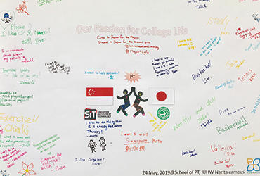 5月24日(金)、本学で海外研修中だったシンガポール工科大学(Singapore Institute of Technology; SIT)理学療法学科2年生14名が成田キャンパスの理学療法学科を訪れ、学生間交流イベントを行いました。本学科からは、マレーシアと中国からの留学生を含む1~3年生22名と教員4名が参加しました。45分程度の限られた時間でしたが、西田裕介理学療法学科長のウェルカムスピーチから始まり、障がい者スポーツ「ボッチャ」を通じた混合チーム戦を行い、大いに盛り上がりました。イベントの最後には、"Our Passion for College Life"と称し、同世代の理学療法学生が熱中していることを寄せ書きし、各々の想いをシェアしました。今夏には、本学科2年生 5名がシンガポール工科大学に海外研修へ行く予定です。今回のイベントを通じて海外への興味が喚起され、さらに深い交流ができるのではないかと期待しています。