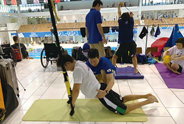ドイツのベルリンで開催されたパラ水泳ワールドシリーズドイツ大会に、日本選手団の理学療法士/トレーナーとして帯同しました。本大会に出場した肢体不自由および視覚障害選手の多くが若手で、2020年東京パラリンピック大会以降の活躍が期待されます。このため、帯同中は大会期間中の急性外傷への対応やレース後のコンディショニングだけでなく、入水前の準備運動指導、練習後のセルフケア指導、補強トレーニングまで教育的な活動にあたりました。さらに、今大会で国際パラ水泳連盟(World Para Swimming; WPS)によるクラス分け(選手の障害の種類および程度によって競技クラスを決定するプロセス。身体機能および泳技術評価が国際クラス分け委員により行われる)を受ける選手のサポートとして、英語-日本語の通訳を経験しました。来年の東京大会開催まで500日を切り、世界各国で競技レベルが上がり続けている現状はさらに加速しています。理学療法士の専門性を生かして競技力の向上に寄与するための方略を常にアップデートし実践する必要性を感じました。最後に、本大会への帯同にあたりご理解およびご協力いただいた日本身体障がい者水泳連盟ならびに本学の関係者の皆様に深謝申し上げます。
