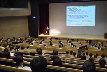 最初に河上裕医学部長が「医学部で何ができるの?」をテーマに講演。本学医学部では、学生7人に1人は留学生、大多数の科目が英語による授業、4週以上の海外臨床実習の必修化、世界最大級5,300㎡のシミュレーションセンター(SCOPE)など最新の学修環境を備えていることを紹介しました。そのうえで、「新しい医学教育の考え方に基づいてゼロから作られた最新のカリキュラムにより将来世界で活躍できる医師の養成をめざす医学部です」と説明しました。