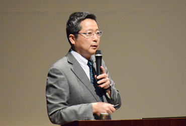 「この国の未来を背負う皆さんへ」と題して講演した河村朗夫・循環器内科学主任教授は、本学の特色として、「教員と生徒の距離が近い、教員の情熱があふれている、ダイバーシティに富んでいる」ことなどを自らの取り組みや体験を踏まえて紹介し、「良質でかつ患者さんに喜んでもらえる医療を提供する」ことを理念としていることを強調しました。