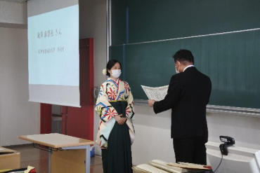 桜の開花がすぐそこまで来ていることを思わせる春の陽気の中で、令和3年度学位記授与式が執り行われました。昨年度同様、新型コロナウイルス感染対策の一環で保護者の方の参列はかなわず、式自体も短縮版での開催となりましたが、卒業生の笑顔があふれる華やかな式となりました。