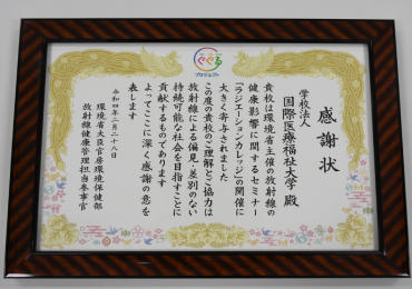 放射線への正しい理解を広げるため、環境省が進める学生セミナー「ラジエーションカレッジ」について、環境省から本学に対し感謝状がこのほど贈られました。