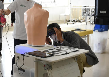 2022年10月に開催した成田キャンパスの文化祭"成翔祭"にて理学療法学科と看護学科の合同企画「Mixed Realityを活用した医療教育体験会~ヒトの体を覗いてみよう~」を開催しました。Mixed Realityとは、現実空間と仮想空間を融合し、目の前に仮想の物体を投影する技術です。体験会ではこのMixed Realityを用いて、呼吸シミュレーターというヒトの上半身の模型の上に、実際の肺や肋骨のモデルを重ねて映し出しました。映し出した映像はアニメーションになっていて、呼吸の音に合わせて肺や横隔膜が動く様子を観察できるようになっています。また、Mixed Realityで映す映像は3次元モデルになるため、実物と同じように裏側にまわって背面を観察したり、下から覗いて横隔膜の構造を細かく観察したりもできます。