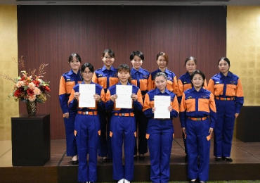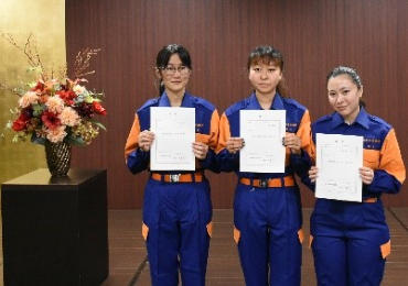 10月3日、成田キャンパスで令和4年度成田市女性消防団辞令交付式が行われ、医学科の1年生女子の川東希さん、野口荒野さん、紀川サミーノまりあさんが新たに入団しました。昨年度までに入団した団員と合わせて計20名が所属することとなり、今後、地元の防災イベントや研修会などに参加して、応急手当指導や火災予防活動などを実践していきます。