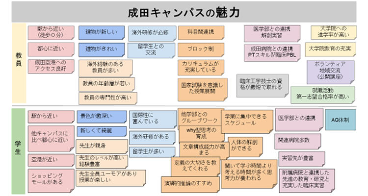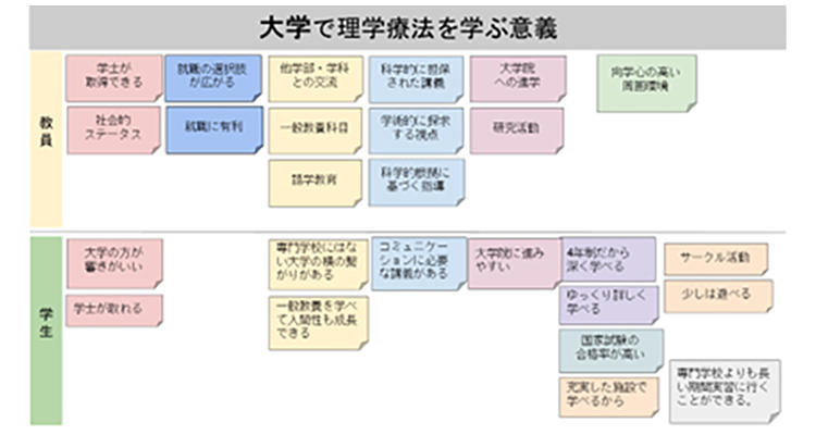 理学療法学科では、授業カリキュラムを充実させるために、様々な取り組みを行っています。今回は、理学療法学科の教員と1年生を対象として、「成田キャンパスの魅力」についてブレインストーミング形式で検討しましたので、一部を紹介いたします。ブレインストーミングとは、同じ目的のために自由な発想で意見交換をする会議の手法です。