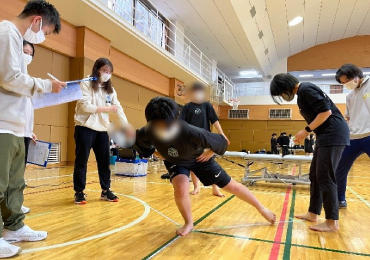 中学生は自身の柔軟性や、筋力等を確認する機会となり、楽しんで取り組んでいました。本学の学生は、授業で学んだことを実践する場に立ち合い、アスリートに対する評価の実施を体験することができました。