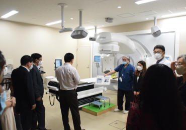 高度医療機器についての説明に聞き入る一行 -