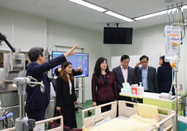 昼食後は世界最大級の成田シミュレーションセンターScopeを視察し、一行は成田キャンパスを後にしました。その後、成田病院へと移動すると、吉野一郎病院長や潮見隆之副院長、桐生茂副院長をはじめとする病院関係者と、ベトナム人初期研修医と実習中の5、6年生が出迎えるなか、健診棟の成田国際ホールから視察をスタートしました。健康増進センター、礼拝室、予防医学センター、リハビリテーションセンター、手術室など各施設の説明を受けながら見学した後、一行は成田地区から東京地区・山王病院へと移動しました。山王病院では、藤井知行病院長による案内で院内を見学しました。今回の視察を通じ、一行からは都度質問が出るなど、興味をもって積極的に見学されている様子が見受けられました。
