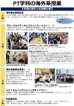 理学療法学科の選択科目として、グローバルメディカルコミュニケーションⅠ・Ⅱがあります。一般的な英会話に加えて、理学療法の医療面接、評価、治療における英会話を体験、練習します。本年度はシンガポールや台湾から来た学生と交流会も行い、より実践的な英会話が学べる科目です。学科トピックス③で、本学学生とビジターとの交流会の様子をより詳しく紹介します。