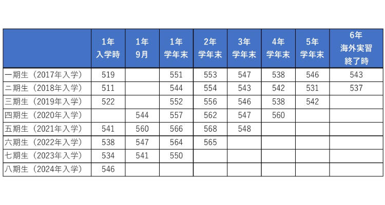 一期生から六期生までは旧カリキュラムでの教育となっており、360時間の英語教育が2年次までに集中していました。3年次以降は全て日本語での教育であったため、TOEFL ITP のスコアも2年終了時をピークとして、その後は漸減する傾向にあります。