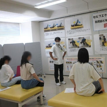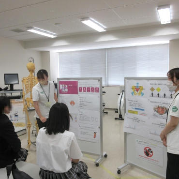また、理学療法の面白さや専門性を体験してもらうために、「Narita Physical Therapy Studio」と題し、柔軟性のチェックとセルフエクササイズ体験を行いました。多くの参加者が体験して下さり、ご自身のカラダの変化に驚いておりました。他にも、学生の研究内容の紹介、学科紹介、個別相談、装具展示を行い、理学療法学科の魅力を知っていただけたのではないかと思います。