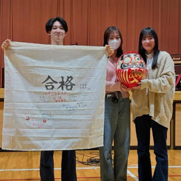試験を万全な状態で迎えるためには、学修だけでなく、生活習慣や体調管理にも細心の注意を払ってきました。当学科では、試験直前まで集中できるよう、「国家試験ツアー」を実施し、試験会場近隣のホテルに前泊します。ホテルでは、いつも通りの食事をとり、いつも通りの時間に就寝します。試験当日も普段通りの時間に起床し、万全なリズムを保ちます。そして、会場に入る前に全員で集まり、学科長の西田先生から激励を受け準備は万全です。