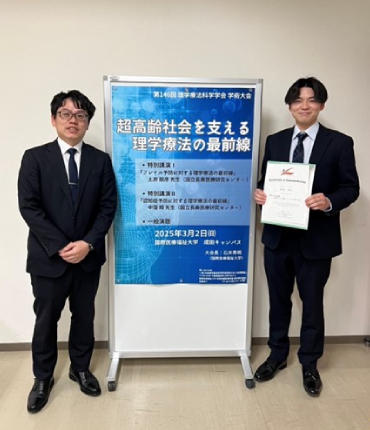この度、2025年3月2日(日)に国際医療福祉大学成田キャンパスで開催された第146回理学療法科学学会学術大会にて、本学大学院修士課程2年の綿貫翔太さん(所属:国際医療福祉大学市川病院、指導教員:西田裕介教授、副指導教員:石井秀明講師、石田武希助教)が「⾼齢者における運動イメージと歩行変動の関係」という演題にて学術大会長賞を獲得しました。