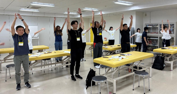 この夏、本学はシンガポールの学生を受け入れ、SIT training course が開催されました。理学療法学科では、日本ならではの「運動×理学療法」を体験するコースを2日間開講し、理学療法学科の教員の牧原・岡道・後藤、シンガポールからの留学生の大学院生Vivianさん、加えて10名ほどの学部生が参加しました。各企画において、学部生たちは各々が作成した企画を英語でプレゼンテーションすることに挑戦しました。特に盛り上がったのはラジオ体操のセッションでした。シンガポールの学生も、自国の伝統的な体操を披露してくれて、相互に交流を深めることができました。今回の取り組みは、"運動"を通してシンガポールの学生と通じ合い、多文化理解が促された二日間となりました。